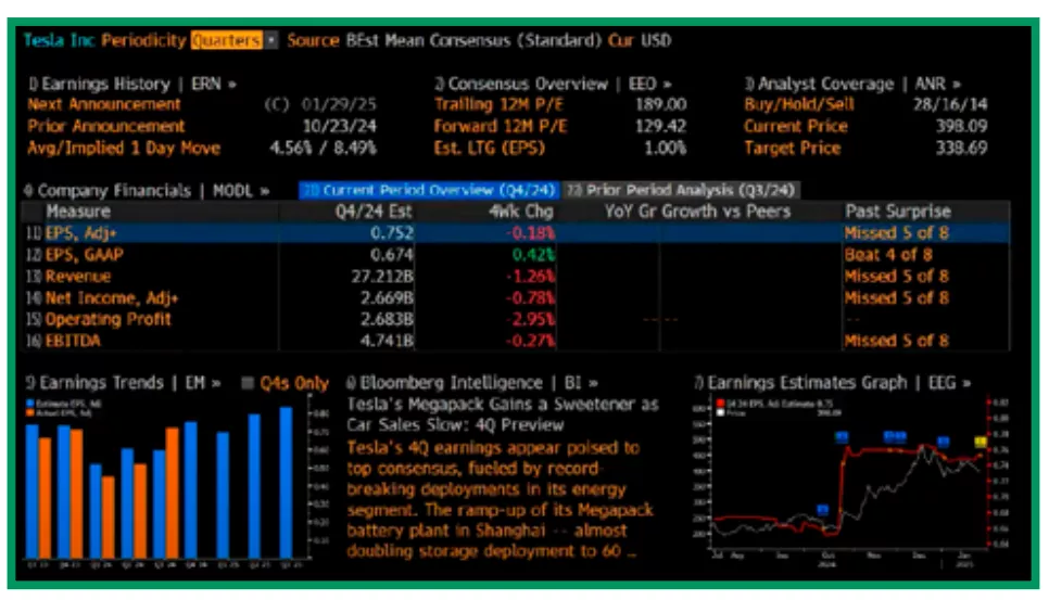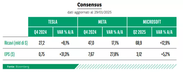Oggi entra nel clou la stagione delle trimestrali a Wall Street con i conti di tre titoli dei Magnifici 7 (Tesla, Meta e Microsoft) e domani sono in arrivo i numeri di Apple. Inizia ad essere più corposa la stagione degli utili anche in Europa, con i conti del colosso tecnologico ASML e alcuni big del settore bancario (Deutsche Bank e BBVA). Fari puntati su Tesla, Meta e Microsoft che si apprestano ad annunciare i risultati del quarto trimestre del 2024 che, secondo il consensus degli analisti raccolto da Bloomberg, dovrebbe mostrare un miglioramento sul confronto a dodici mesi, a coronamento di un anno da record. L’appuntamento con i conti delle tre big tech sarà importante