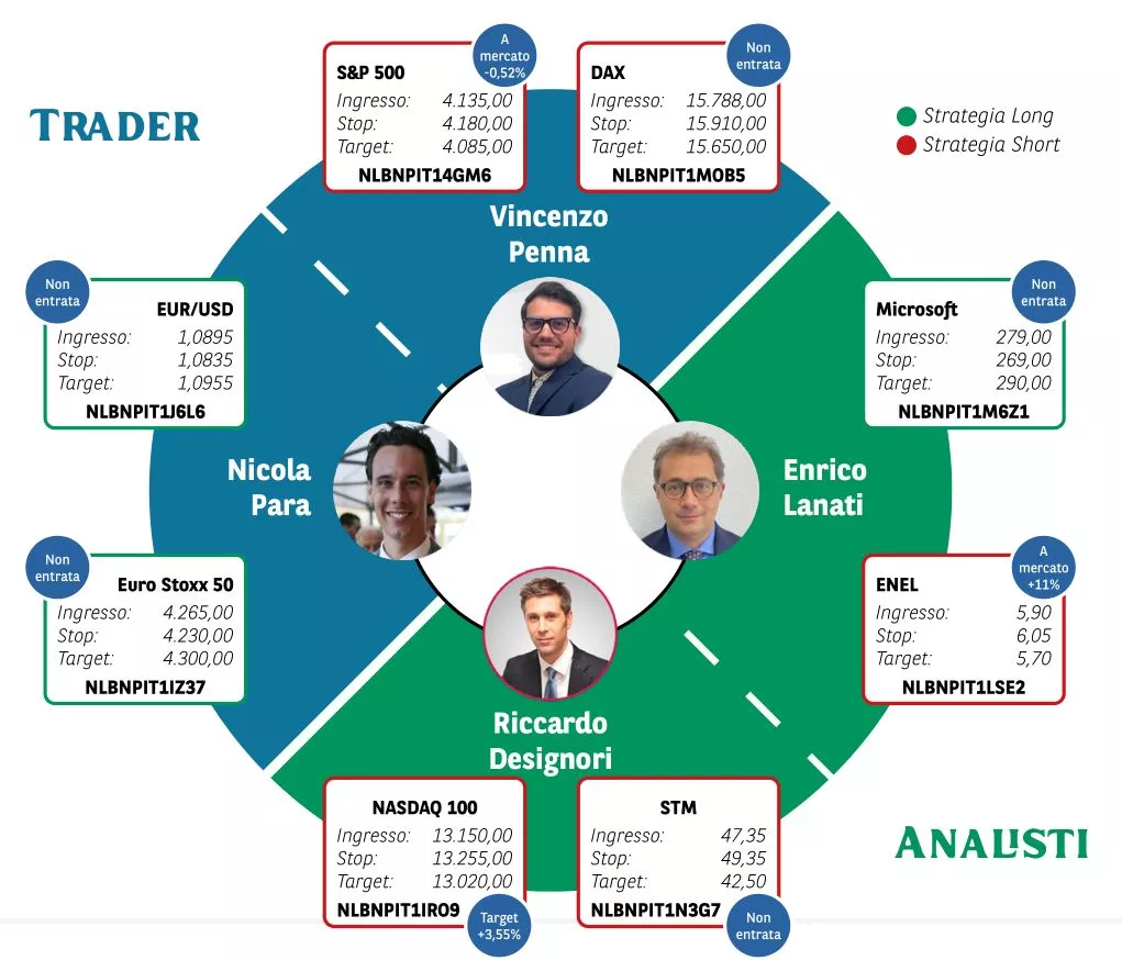 Borsa in Diretta è la newsletter giornaliera di BNP Paribas. Ogni lunedì non perderti l'appuntamento di Weekly FTSE MIB, pillola video in cui si analizza il principale indice di Borsa Italiana e si forniscono strategie operative per la settimana entrante. Inoltre, quotidianamente riceverai informazioni riguardanti notizie finanziarie e appuntamenti macroeconomici della giornata, analisi tecnica dei principali indici azionari FTSE MIB, DAX e S&P500 e aggiornamenti delle Trade Idea fatte dai migliori trader italiani durante House of Trading.