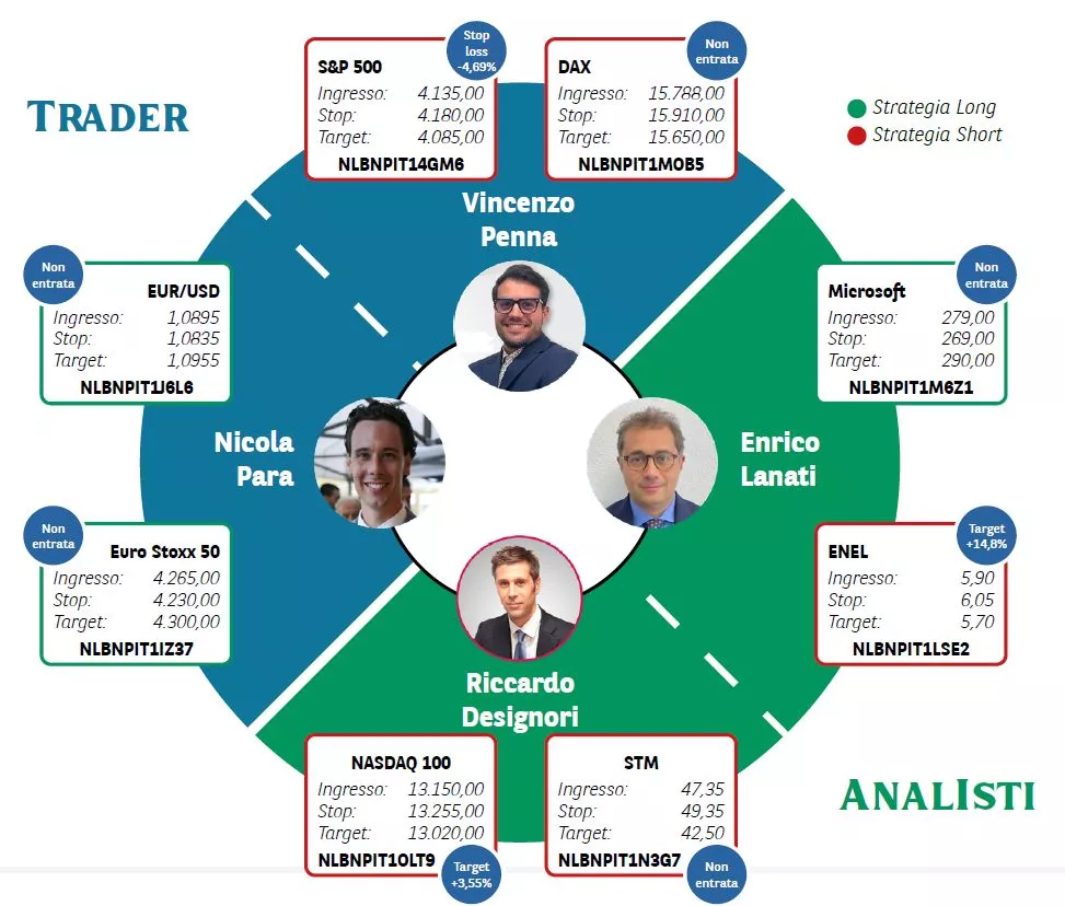 Borsa in Diretta è la newsletter giornaliera di BNP Paribas. Ogni lunedì non perderti l'appuntamento di Weekly FTSE MIB, pillola video in cui si analizza il principale indice di Borsa Italiana e si forniscono strategie operative per la settimana entrante. Inoltre, quotidianamente riceverai informazioni riguardanti notizie finanziarie e appuntamenti macroeconomici della giornata, analisi tecnica dei principali indici azionari FTSE MIB, DAX e S&P500 e aggiornamenti delle Trade Idea fatte dai migliori trader italiani durante House of Trading.