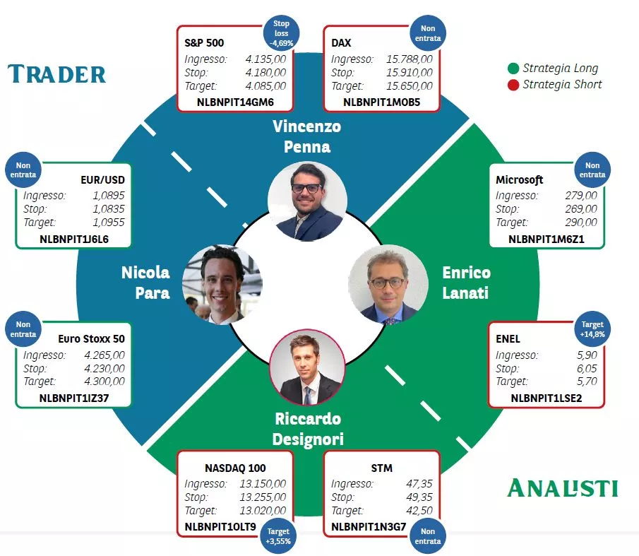 Borsa in Diretta è la newsletter giornaliera di BNP Paribas. Ogni lunedì non perderti l'appuntamento di Weekly FTSE MIB, pillola video in cui si analizza il principale indice di Borsa Italiana e si forniscono strategie operative per la settimana entrante. Inoltre, quotidianamente riceverai informazioni riguardanti notizie finanziarie e appuntamenti macroeconomici della giornata, analisi tecnica dei principali indici azionari FTSE MIB, DAX e S&P500 e aggiornamenti delle Trade Idea fatte dai migliori trader italiani durante House of Trading.