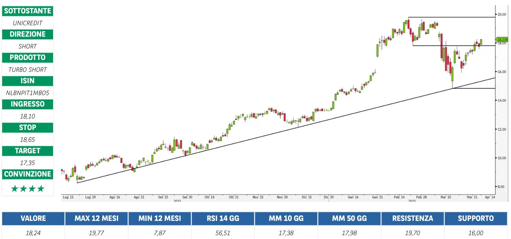 Prima di adottare una decisione di investimento al fine di comprendere appieno i potenziali rischi e benefici connessi alla decisione di investire negli strumenti finanziari quivi menzionati, si invita a leggere attentamente la relativa documentazione di offerta e/o quotazione e, in particolare, le sezioni dedicate ai fattori di rischio connessi all’investimento, ai relativi costi e al trattamento fiscale, e il relativo documento contenente le informazioni chiave (KID), ove disponibile. Tale documentazione è disponibile sul sito web investimenti.bnpparibas.it. L’investimento negli strumenti finanziari quivi menzionati può comportare il rischio di perdita totale o parziale del capitale inizialmente investito. Ove tali strumenti finanziari siano venduti prima della scadenza, l’investitore potrà incorrere anche in perdite in conto capitale. Nel caso in cui tali strumenti finanziari siano acquistati o venduti nel corso della loro durata, il rendimento potrà variare. La presente pubblicazione costituisce materiale pubblicitario e le informazioni in essa contenute hanno scopo meramente informativo e promozionale e non sono da intendersi in alcun modo come ricerca, sollecitazione o raccomandazione all’investimento, offerta al pubblico o consulenza in materia di investimenti. Le informazioni e i grafici a contenuto finanziario quivi riportati sono meramente indicativi e hanno scopo esclusivamente esemplificativo e non esaustivo. I rendimenti passati non sono indicativi, né sono garanzia, dei rendimenti futuri. È responsabilità dell’investitore effettuare un’accurata analisi di tutti i profili fiscali, legali e regolamentari (inclusi i fattori di rischio, tra i quali, i fattori di rischio legati ai tassi di interesse, i fattori di rischio di default e i fattori di rischio legati all’assenza di liquidità) connessi all’investimento negli strumenti finanziari quivi menzionati. BNP Paribas e/o altra società del gruppo BNP Paribas non potranno essere considerate responsabili delle conseguenze finanziarie o di altra natura derivanti dall’investimento in tali strumenti finanziari. Informazioni aggiornate sulla quotazione di questi ultimi sono disponibili sul sito web investimenti.bnpparibas.it. Le raccomandazioni di investimento quivi contenute non soddisfano i requisiti di legge relativi all’indipendenza della ricerca in materia di investimenti e non sono soggette ad alcun divieto di esecuzione di operazioni su strumenti finanziari prima della loro divulgazione.
