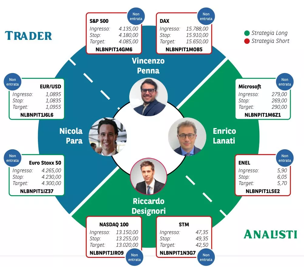 Borsa in Diretta è la newsletter giornaliera di BNP Paribas. Ogni lunedì non perderti l'appuntamento di Weekly FTSE MIB, pillola video in cui si analizza il principale indice di Borsa Italiana e si forniscono strategie operative per la settimana entrante. Inoltre, quotidianamente riceverai informazioni riguardanti notizie finanziarie e appuntamenti macroeconomici della giornata, analisi tecnica dei principali indici azionari FTSE MIB, DAX e S&P500 e aggiornamenti delle Trade Idea fatte dai migliori trader italiani durante House of Trading.