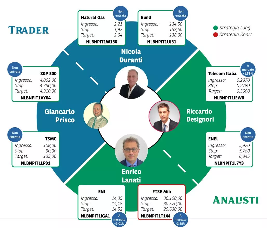 Borsa in Diretta è la newsletter giornaliera di BNP Paribas. Ogni lunedì non perderti l'appuntamento di Weekly FTSE MIB, pillola video in cui si analizza il principale indice di Borsa Italiana e si forniscono strategie operative per la settimana entrante. Inoltre, quotidianamente riceverai informazioni riguardanti notizie finanziarie e appuntamenti macroeconomici della giornata, analisi tecnica dei principali indici azionari FTSE MIB, DAX e S&P500 e aggiornamenti delle Trade Idea fatte dai migliori trader italiani durante House of Trading.