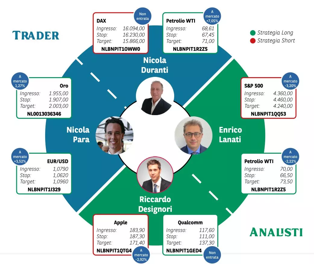 Borsa in Diretta è la newsletter giornaliera di BNP Paribas. Ogni lunedì non perderti l'appuntamento di Weekly FTSE MIB, pillola video in cui si analizza il principale indice di Borsa Italiana e si forniscono strategie operative per la settimana entrante. Inoltre, quotidianamente riceverai informazioni riguardanti notizie finanziarie e appuntamenti macroeconomici della giornata, analisi tecnica dei principali indici azionari FTSE MIB, DAX e S&P500 e aggiornamenti delle Trade Idea fatte dai migliori trader italiani durante House of Trading.