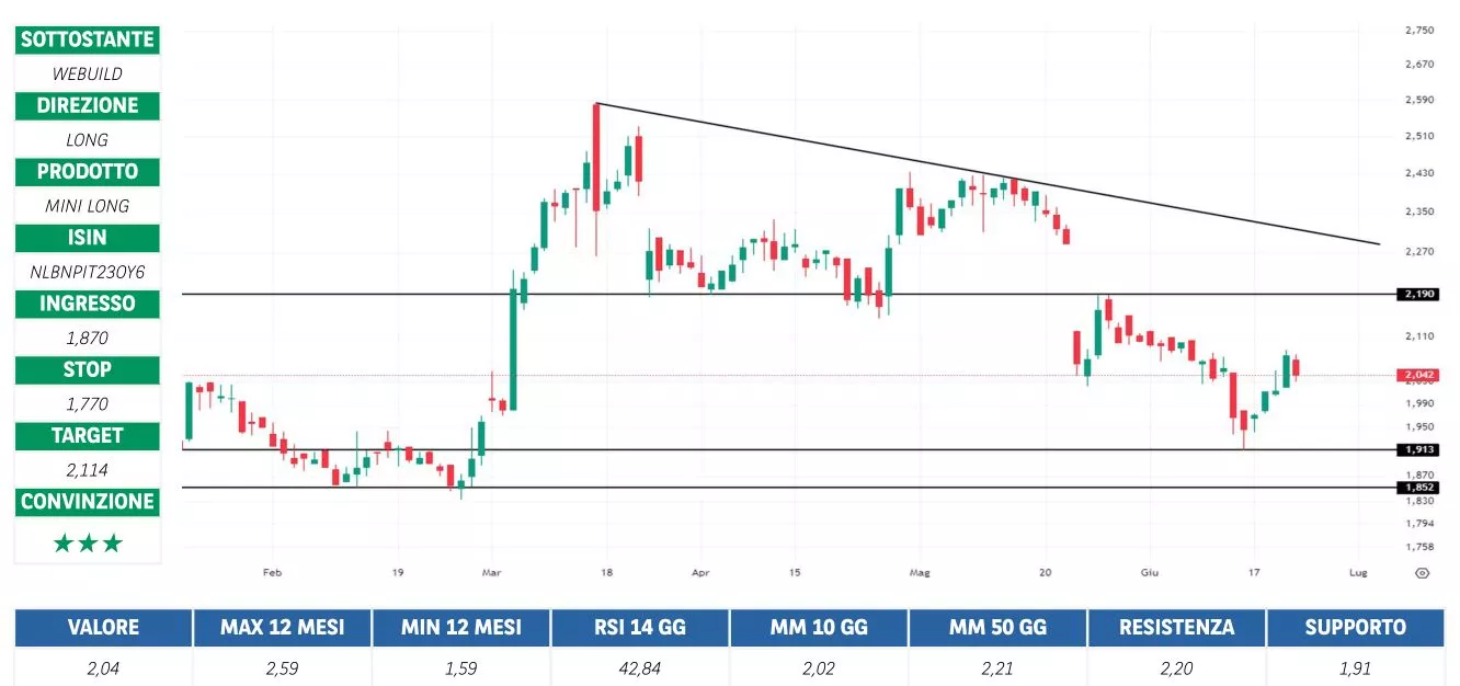 Prima di adottare una decisione di investimento al fine di comprendere appieno i potenziali rischi e benefici connessi alla decisione di investire negli strumenti finanziari quivi menzionati, si invita a leggere attentamente la relativa documentazione di offerta e/o quotazione e, in particolare, le sezioni dedicate ai fattori di rischio connessi all’investimento, ai relativi costi e al trattamento fiscale, e il relativo documento contenente le informazioni chiave (KID), ove disponibile. Tale documentazione è disponibile sul sito web investimenti.bnpparibas.it. L’investimento negli strumenti finanziari quivi menzionati può comportare il rischio di perdita totale o parziale del capitale inizialmente investito. Ove tali strumenti finanziari siano venduti prima della scadenza, l’investitore potrà incorrere anche in perdite in conto capitale. Nel caso in cui tali strumenti finanziari siano acquistati o venduti nel corso della loro durata, il rendimento potrà variare. La presente pubblicazione costituisce materiale pubblicitario e le informazioni in essa contenute hanno scopo meramente informativo e promozionale e non sono da intendersi in alcun modo come ricerca, sollecitazione o raccomandazione all’investimento, offerta al pubblico o consulenza in materia di investimenti. Le informazioni e i grafici a contenuto finanziario quivi riportati sono meramente indicativi e hanno scopo esclusivamente esemplificativo e non esaustivo. I rendimenti passati non sono indicativi, né sono garanzia, dei rendimenti futuri. È responsabilità dell’investitore effettuare un’accurata analisi di tutti i profili fiscali, legali e regolamentari (inclusi i fattori di rischio, tra i quali, i fattori di rischio legati ai tassi di interesse, i fattori di rischio di default e i fattori di rischio legati all’assenza di liquidità) connessi all’investimento negli strumenti finanziari quivi menzionati. BNP Paribas e/o altra società del gruppo BNP Paribas non potranno essere considerate responsabili delle conseguenze finanziarie o di altra natura derivanti dall’investimento in tali strumenti finanziari. Informazioni aggiornate sulla quotazione di questi ultimi sono disponibili sul sito web investimenti.bnpparibas.it. Le raccomandazioni di investimento quivi contenute non soddisfano i requisiti di legge relativi all’indipendenza della ricerca in materia di investimenti e non sono soggette ad alcun divieto di esecuzione di operazioni su strumenti finanziari prima della loro divulgazione.
