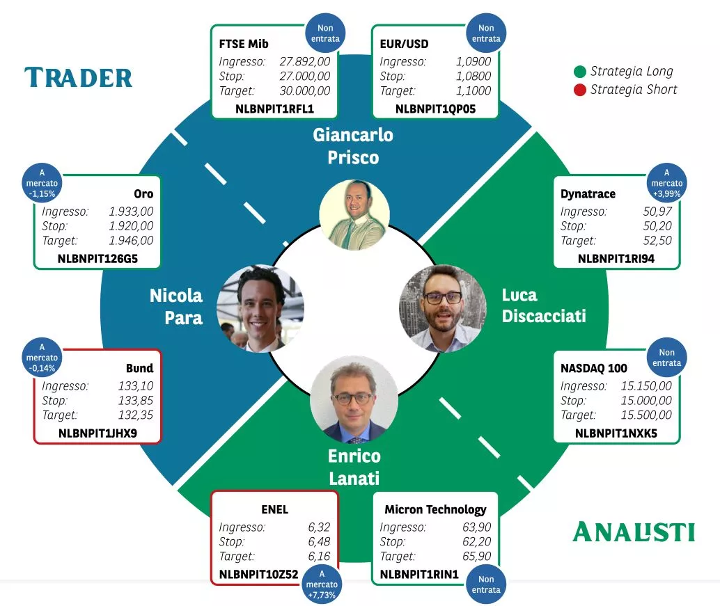 Borsa in Diretta è la newsletter giornaliera di BNP Paribas. Ogni lunedì non perderti l'appuntamento di Weekly FTSE MIB, pillola video in cui si analizza il principale indice di Borsa Italiana e si forniscono strategie operative per la settimana entrante. Inoltre, quotidianamente riceverai informazioni riguardanti notizie finanziarie e appuntamenti macroeconomici della giornata, analisi tecnica dei principali indici azionari FTSE MIB, DAX e S&P500 e aggiornamenti delle Trade Idea fatte dai migliori trader italiani durante House of Trading.