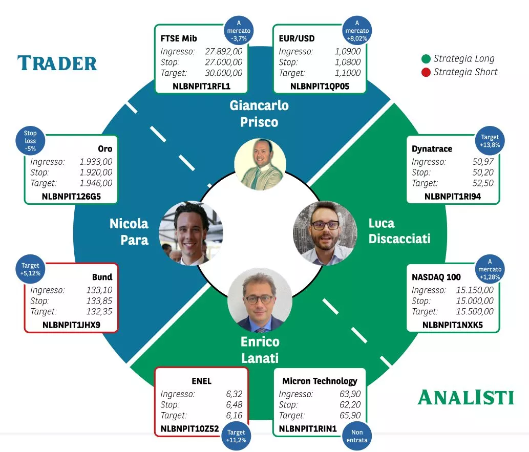 Borsa in Diretta è la newsletter giornaliera di BNP Paribas. Ogni lunedì non perderti l'appuntamento di Weekly FTSE MIB, pillola video in cui si analizza il principale indice di Borsa Italiana e si forniscono strategie operative per la settimana entrante. Inoltre, quotidianamente riceverai informazioni riguardanti notizie finanziarie e appuntamenti macroeconomici della giornata, analisi tecnica dei principali indici azionari FTSE MIB, DAX e S&P500 e aggiornamenti delle Trade Idea fatte dai migliori trader italiani durante House of Trading.