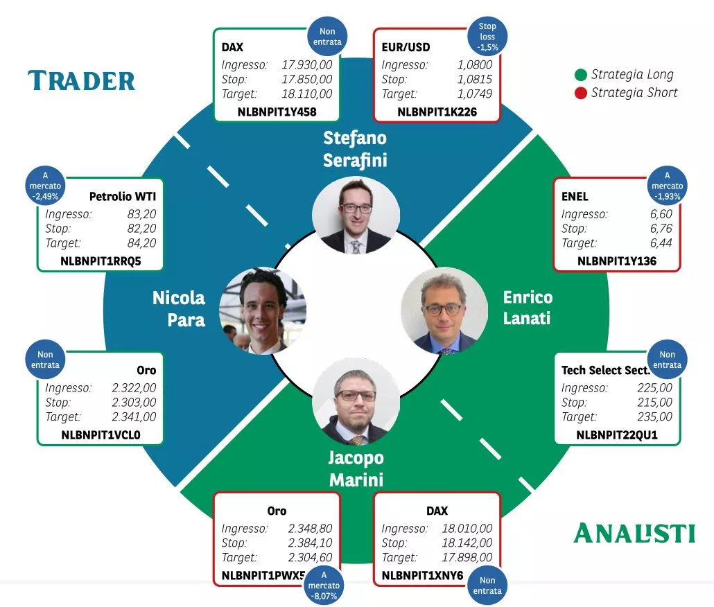 Borsa in Diretta è la newsletter giornaliera di BNP Paribas. Ogni lunedì non perderti l'appuntamento di Weekly FTSE MIB, pillola video in cui si analizza il principale indice di Borsa Italiana e si forniscono strategie operative per la settimana entrante. Inoltre, quotidianamente riceverai informazioni riguardanti notizie finanziarie e appuntamenti macroeconomici della giornata, analisi tecnica dei principali indici azionari FTSE MIB, DAX e S&P500 e aggiornamenti delle Trade Idea fatte dai migliori trader italiani durante House of Trading.