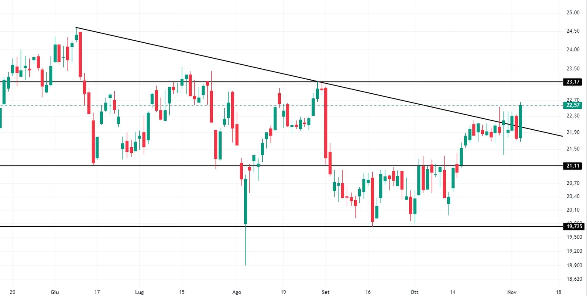 Prima di adottare una decisione di investimento al fine di comprendere appieno i potenziali rischi e benefici connessi alla decisione di investire negli strumenti finanziari quivi menzionati, si invita a leggere attentamente la relativa documentazione di offerta e/o quotazione e, in particolare, le sezioni dedicate ai fattori di rischio connessi all’investimento, ai relativi costi e al trattamento fiscale, e il relativo documento contenente le informazioni chiave (KID), ove disponibile. Tale documentazione è disponibile sul sito web investimenti.bnpparibas.it. L’investimento negli strumenti finanziari quivi menzionati può comportare il rischio di perdita totale o parziale del capitale inizialmente investito. Ove tali strumenti finanziari siano venduti prima della scadenza, l’investitore potrà incorrere anche in perdite in conto capitale. Nel caso in cui tali strumenti finanziari siano acquistati o venduti nel corso della loro durata, il rendimento potrà variare. La presente pubblicazione costituisce materiale pubblicitario e le informazioni in essa contenute hanno scopo meramente informativo e promozionale e non sono da intendersi in alcun modo come ricerca, sollecitazione o raccomandazione all’investimento, offerta al pubblico o consulenza in materia di investimenti. Le informazioni e i grafici a contenuto finanziario quivi riportati sono meramente indicativi e hanno scopo esclusivamente esemplificativo e non esaustivo. I rendimenti passati non sono indicativi, né sono garanzia, dei rendimenti futuri. È responsabilità dell’investitore effettuare un’accurata analisi di tutti i profili fiscali, legali e regolamentari (inclusi i fattori di rischio, tra i quali, i fattori di rischio legati ai tassi di interesse, i fattori di rischio di default e i fattori di rischio legati all’assenza di liquidità) connessi all’investimento negli strumenti finanziari quivi menzionati. BNP Paribas e/o altra società del gruppo BNP Paribas non potranno essere considerate responsabili delle conseguenze finanziarie o di altra natura derivanti dall’investimento in tali strumenti finanziari. Informazioni aggiornate sulla quotazione di questi ultimi sono disponibili sul sito web investimenti.bnpparibas.it. Le raccomandazioni di investimento quivi contenute non soddisfano i requisiti di legge relativi all’indipendenza della ricerca in materia di investimenti e non sono soggette ad alcun divieto di esecuzione di operazioni su strumenti finanziari prima della loro divulgazione.