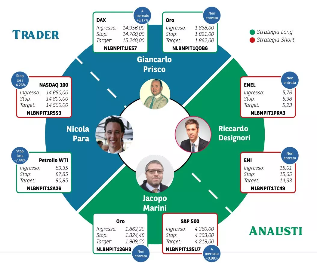Borsa in Diretta è la newsletter giornaliera di BNP Paribas. Ogni lunedì non perderti l'appuntamento di Weekly FTSE MIB, pillola video in cui si analizza il principale indice di Borsa Italiana e si forniscono strategie operative per la settimana entrante. Inoltre, quotidianamente riceverai informazioni riguardanti notizie finanziarie e appuntamenti macroeconomici della giornata, analisi tecnica dei principali indici azionari FTSE MIB, DAX e S&P500 e aggiornamenti delle Trade Idea fatte dai migliori trader italiani durante House of Trading.