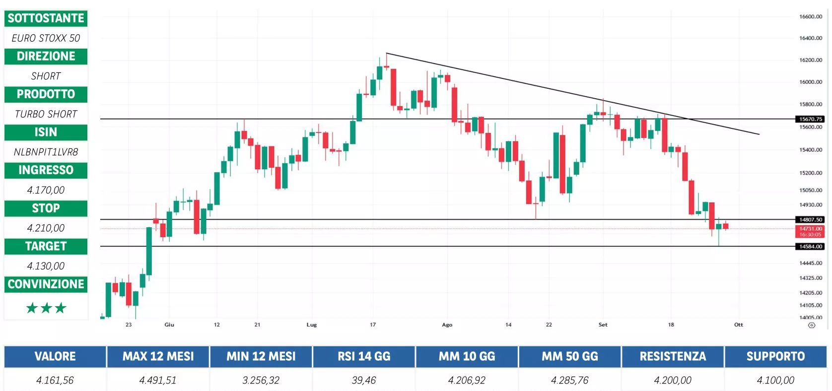 Prima di adottare una decisione di investimento al fine di comprendere appieno i potenziali rischi e benefici connessi alla decisione di investire negli strumenti finanziari quivi menzionati, si invita a leggere attentamente la relativa documentazione di offerta e/o quotazione e, in particolare, le sezioni dedicate ai fattori di rischio connessi all’investimento, ai relativi costi e al trattamento fiscale, e il relativo documento contenente le informazioni chiave (KID), ove disponibile. Tale documentazione è disponibile sul sito web investimenti.bnpparibas.it. L’investimento negli strumenti finanziari quivi menzionati può comportare il rischio di perdita totale o parziale del capitale inizialmente investito. Ove tali strumenti finanziari siano venduti prima della scadenza, l’investitore potrà incorrere anche in perdite in conto capitale. Nel caso in cui tali strumenti finanziari siano acquistati o venduti nel corso della loro durata, il rendimento potrà variare. La presente pubblicazione costituisce materiale pubblicitario e le informazioni in essa contenute hanno scopo meramente informativo e promozionale e non sono da intendersi in alcun modo come ricerca, sollecitazione o raccomandazione all’investimento, offerta al pubblico o consulenza in materia di investimenti. Le informazioni e i grafici a contenuto finanziario quivi riportati sono meramente indicativi e hanno scopo esclusivamente esemplificativo e non esaustivo. I rendimenti passati non sono indicativi, né sono garanzia, dei rendimenti futuri. È responsabilità dell’investitore effettuare un’accurata analisi di tutti i profili fiscali, legali e regolamentari (inclusi i fattori di rischio, tra i quali, i fattori di rischio legati ai tassi di interesse, i fattori di rischio di default e i fattori di rischio legati all’assenza di liquidità) connessi all’investimento negli strumenti finanziari quivi menzionati. BNP Paribas e/o altra società del gruppo BNP Paribas non potranno essere considerate responsabili delle conseguenze finanziarie o di altra natura derivanti dall’investimento in tali strumenti finanziari. Informazioni aggiornate sulla quotazione di questi ultimi sono disponibili sul sito web investimenti.bnpparibas.it. Le raccomandazioni di investimento quivi contenute non soddisfano i requisiti di legge relativi all’indipendenza della ricerca in materia di investimenti e non sono soggette ad alcun divieto di esecuzione di operazioni su strumenti finanziari prima della loro divulgazione.