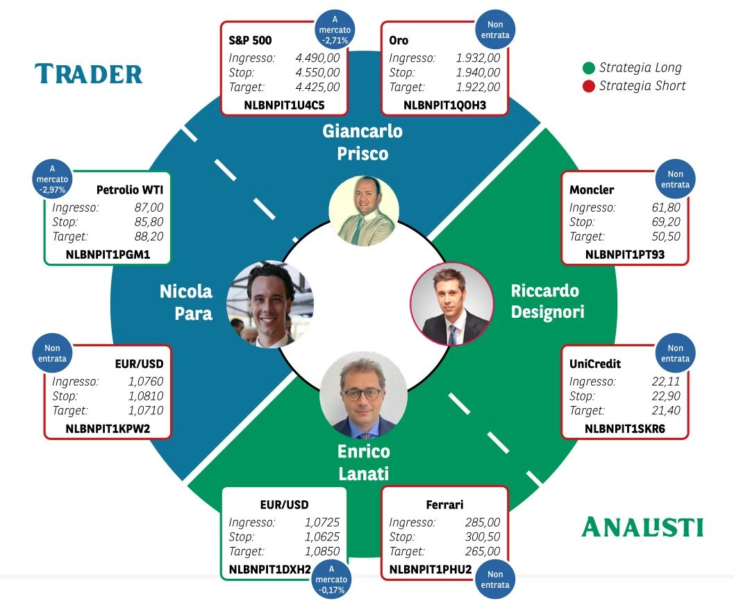Borsa in Diretta è la newsletter giornaliera di BNP Paribas. Ogni lunedì non perderti l'appuntamento di Weekly FTSE MIB, pillola video in cui si analizza il principale indice di Borsa Italiana e si forniscono strategie operative per la settimana entrante. Inoltre, quotidianamente riceverai informazioni riguardanti notizie finanziarie e appuntamenti macroeconomici della giornata, analisi tecnica dei principali indici azionari FTSE MIB, DAX e S&P500 e aggiornamenti delle Trade Idea fatte dai migliori trader italiani durante House of Trading.