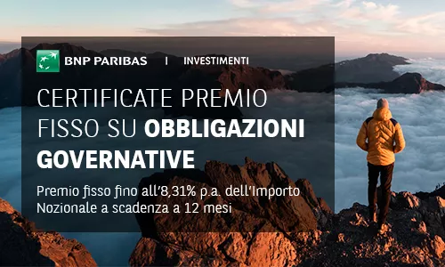 Iscriviti a il "CERTIFICATE JOURNAL", IL PRIMO PRODOTTO EDITORIALE INTERAMENTE DEDICATO AI CERTIFICATI DI INVESTIMENTO https://www.certificatiederivati.it/landingPageBNPNew.asp?view=details&c=evidenza