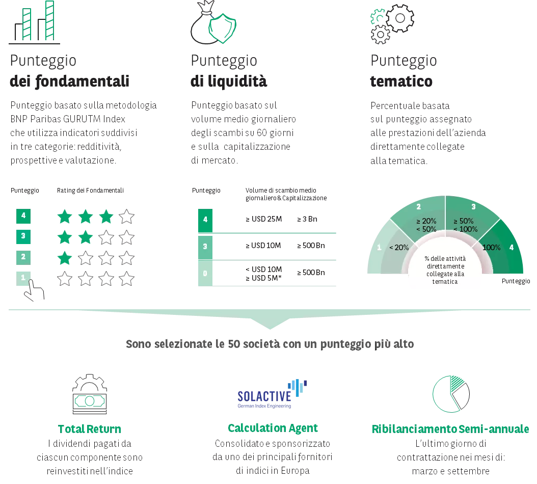 BNP Paribas seleziona e pondera le aziende sulla base di un punteggio aggregato, sulla base di 3 specifiche variabili, ognuna della quale contribuisce al punteggio aggregato: fondamentali economici, capitalizzazione di mercato, correlazione delle attività al settore della gestione dei rifiuti.
