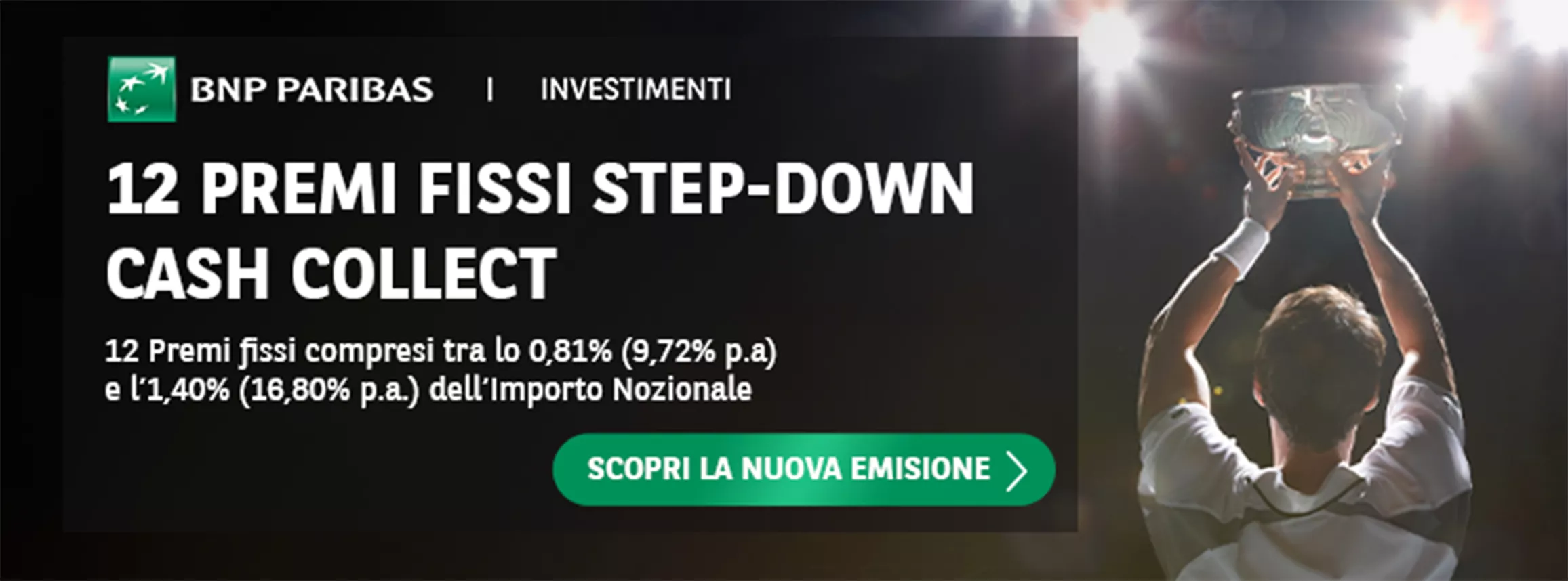 Accanto ai Certificate Low Barrier, l’offerta BNP Paribas include varie opzioni di Cash Collect Certificate: One Star Step-Down Cash Collect, Premi Fissi Cash Collect, Maxi Cash Collect, Airbag Cash Collect..